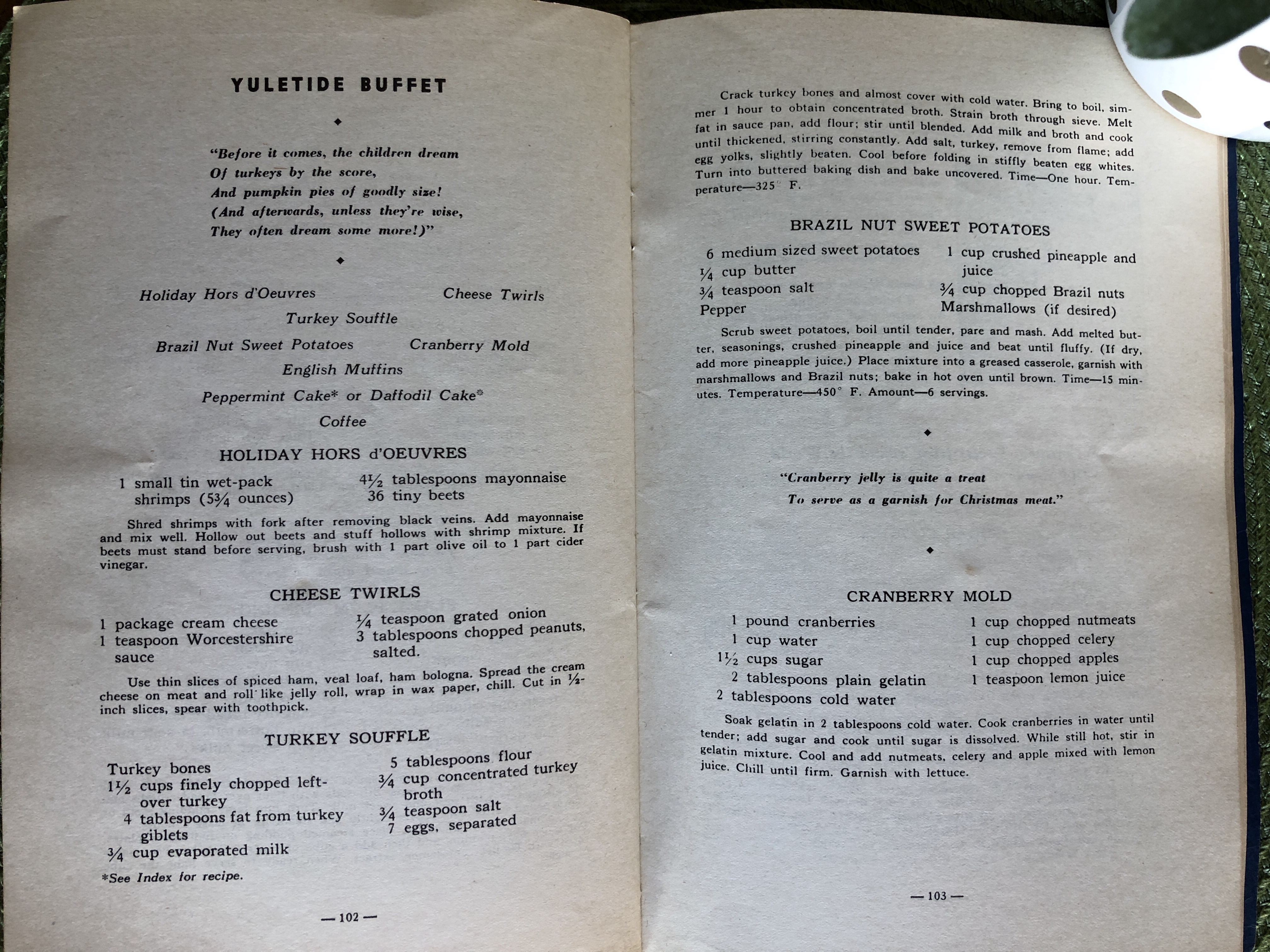 I wanted to start off December with a different kind of First Monday Menu. I’ve been researching different holiday menus, and I thought I’d add a few here so you can see what a Christmas dinner in the early 1940s might have looked like.