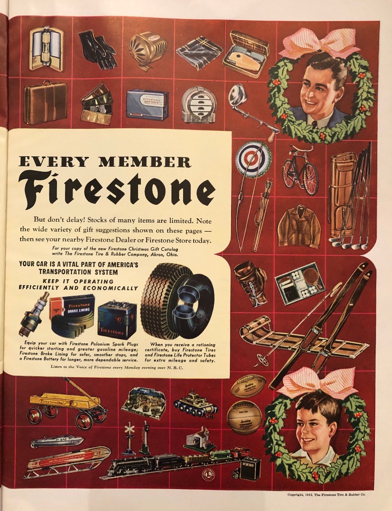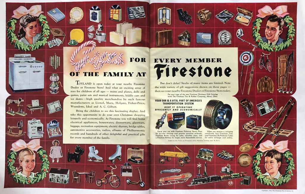 I love the holiday advertisements in old magazines. I thought I’d show you one of my favorites. I like the idea of a housewife pouring over these ads while making her shopping list. I can imagine her children pointing at the toys and dreaming about what gifts would be under the tree on Christmas morning. The local Firestone dealer or store had a wide variety of gifts, and I’m sure on Christmas Eve the stores were full of last minute shoppers. Enjoy the details in this ad. I think it’s a wonderful glimpse into Christmas past.