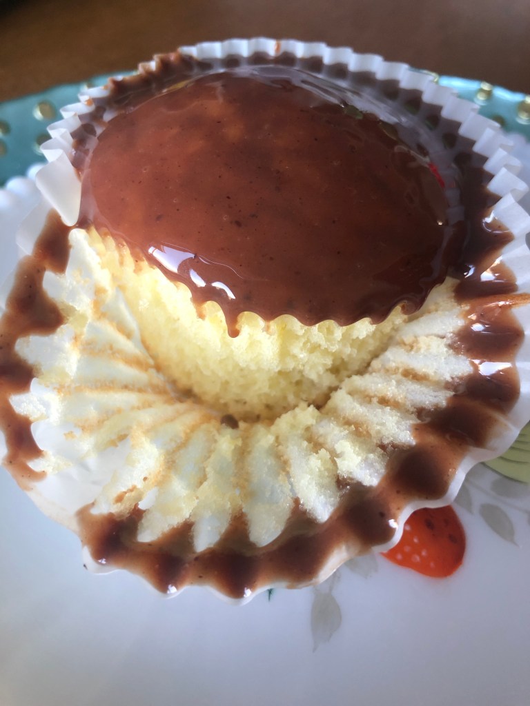 Not one of my taste testers liked the frosting. It was somehow runny and thick at the same time. The consistency was more like an oily syrup. One of my sons said it felt like he was eating slime. The cupcakes soaked up the frosting so quickly that by the time we called everyone to the kitchen, it looked like we had poured chocolate water over them instead of frosting. The frosting did have a nice, not overly sweet chocolate flavor, but that’s about all I can say in favor of it. Well, and it was shiny and reflected light like a mirror. It was actually quite lovely to look at after it was freshly applied to the cupcake.