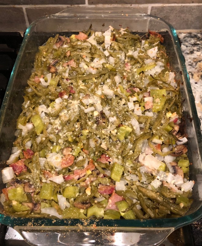 What a delicious green bean dish! The different colors, textures, and tastes complimented each other very well. I would definitely add the bacon if I make this again. You can taste a very slight bit of vinegar, but not enough to be off-putting. I like this type of side dish because it goes with everything. We had it with parmesan chicken, but I can see it being a perfect side to a hamburger, fried chicken or meatloaf. It would be an easy, flavorful potluck dish. Bring the recipe with you. People will ask for it. It’s that good.