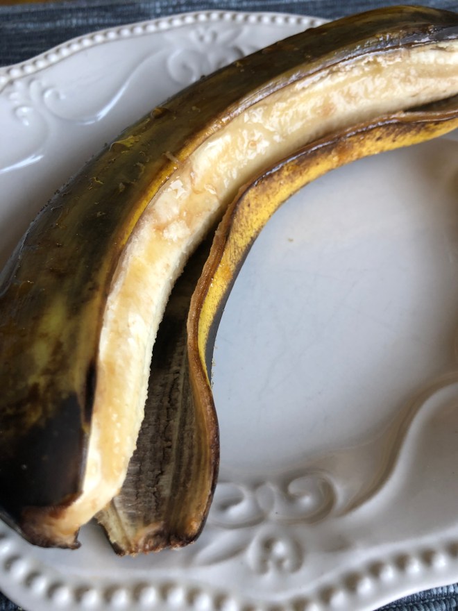 We baked these until we were worried the peel would burn. The bananas were tender but not mushy and there was a sweet syrup inside the peel. This isn’t a pretty dish, but it would make a nice after school treat or a quick dessert. We ate ours right out of the peel, but you could slice or mush the fruit and put it on a sandwich with peanut butter or use it as a sundae topping.
