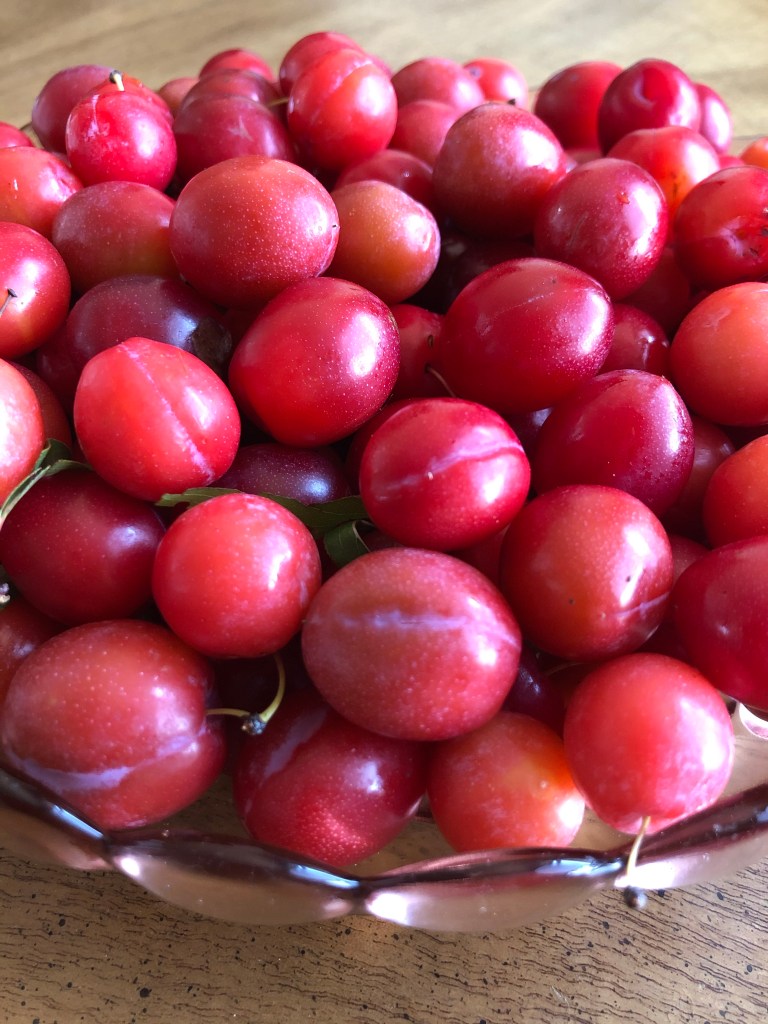 The plums vary in size and color. The best ones are the size of a small cherry and are a deep red. Those are the ones that are sweet and juicy. The smaller and more yellow plums are quite tart. The sweet ones are great eaten fresh off the tree, but the tart ones still are amazing in jelly.