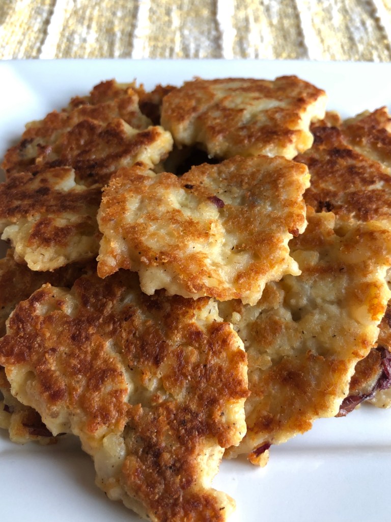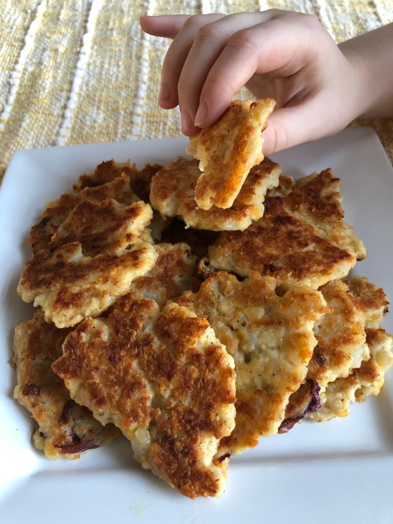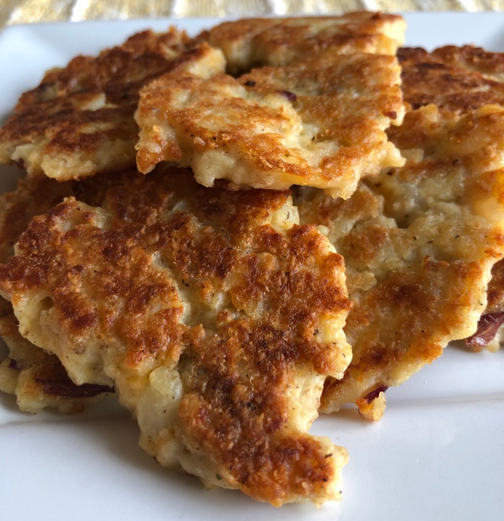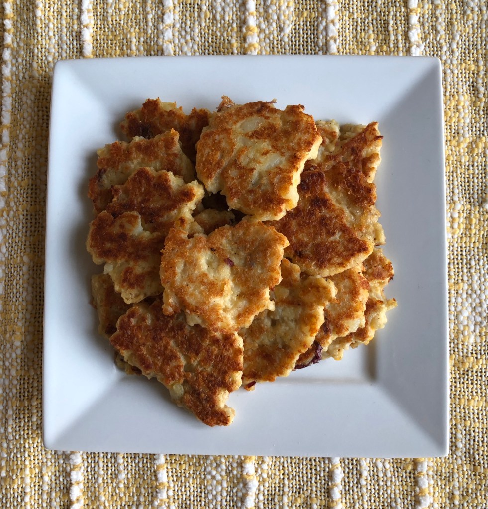 My husband made these patties to go with our root-beer glazed chicken tonight. He hadn’t been cooking long before he called me in to have a sample. They were delicious. Warm and just a little crispy, they were just the right size to eat with our hands while discussing what else would taste good with them. I think adding a little onion or maybe some diced peppers would add a little extra flavor and texture. He thought adding small pieces of bacon would make them just about perfect. I liked the cheese in the potato patties. They were so creamy and delicious with a perfectly browned outside. These are definitely being added to our every day recipes.