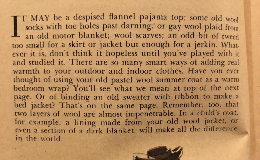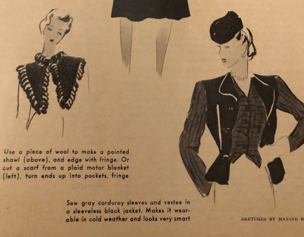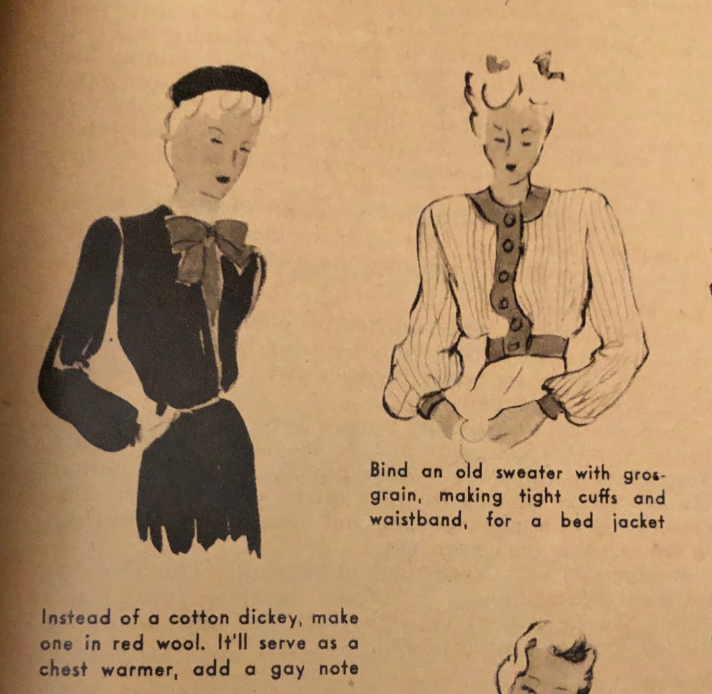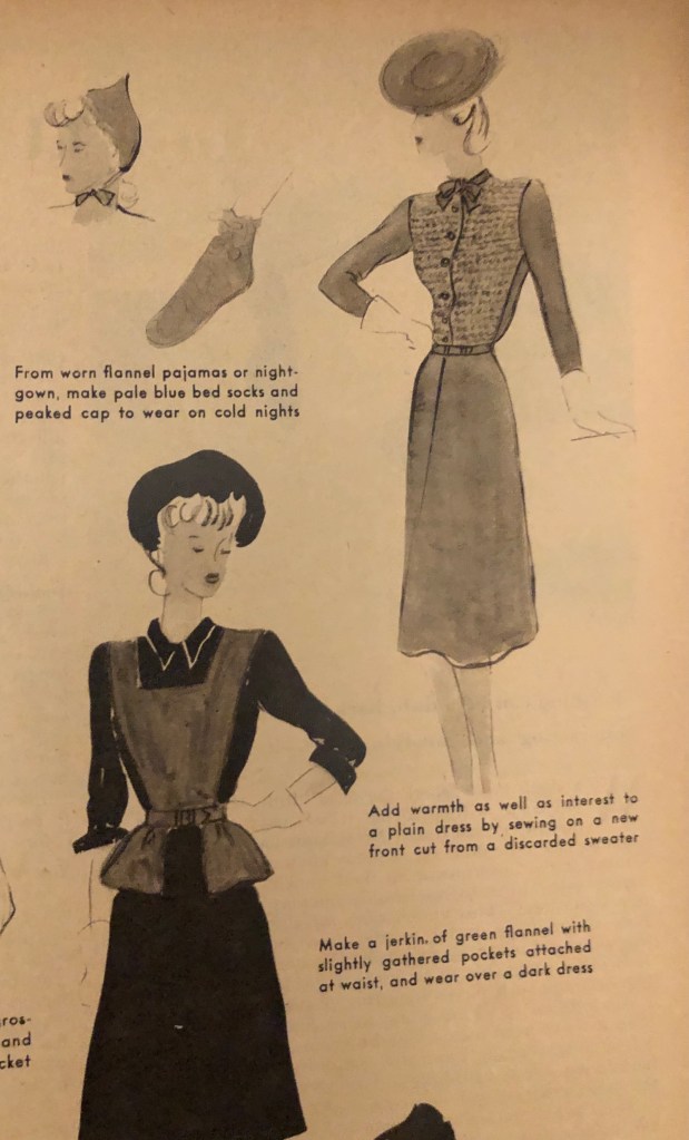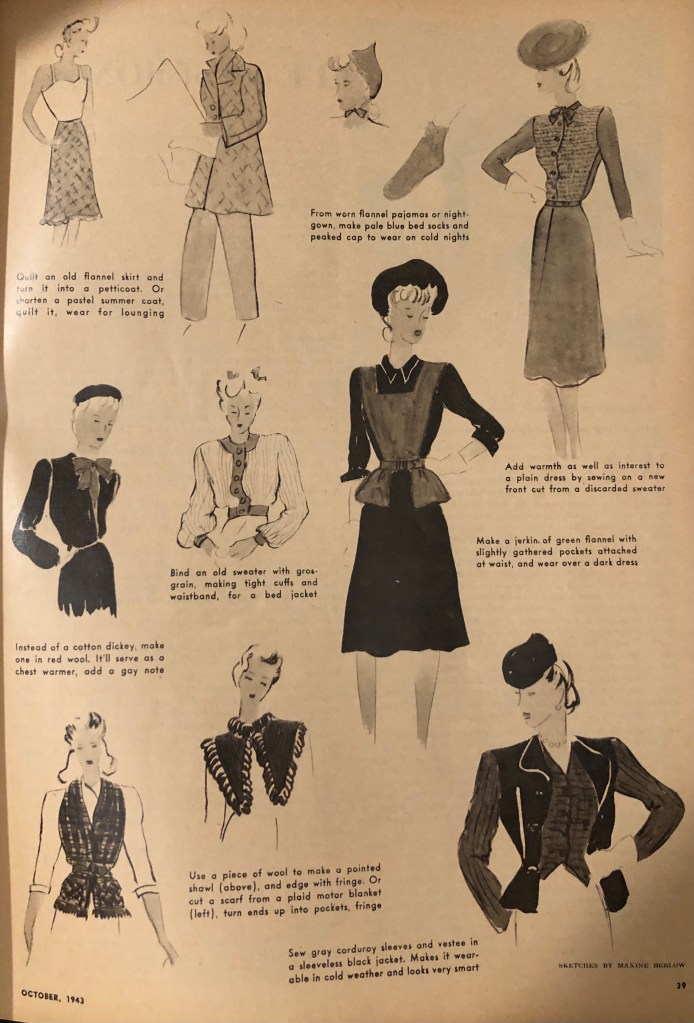 It’s that time of year again. Time to bring out the warmer clothes if you are in a place headed for fall and winter. During the war years, closed factories and shortages sometimes meant figuring out new ways to use old clothing to keep warm during cold months. Now, it was over 100°F this weekend here in Texas, but I know that there are many of you who are gearing up for cold weather. Maybe some of these hints from the October 1943 issue of Woman’s Day will spark some new ideas of your own. I’ve included the entire article, but there are some zoomed in photos afterwards so you can more easily read the captions.