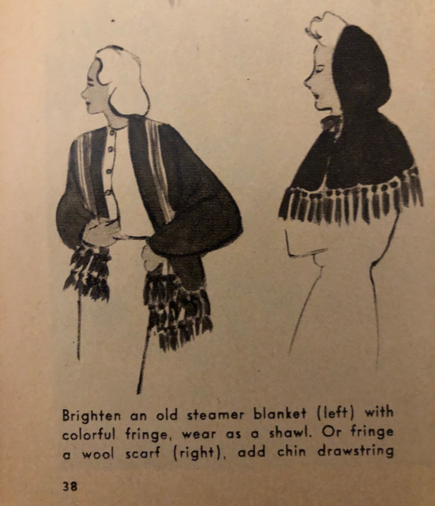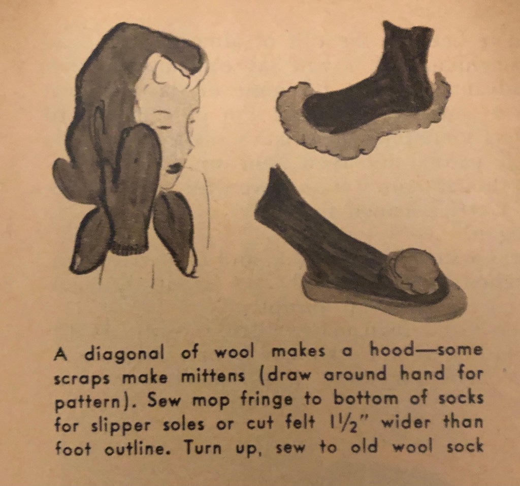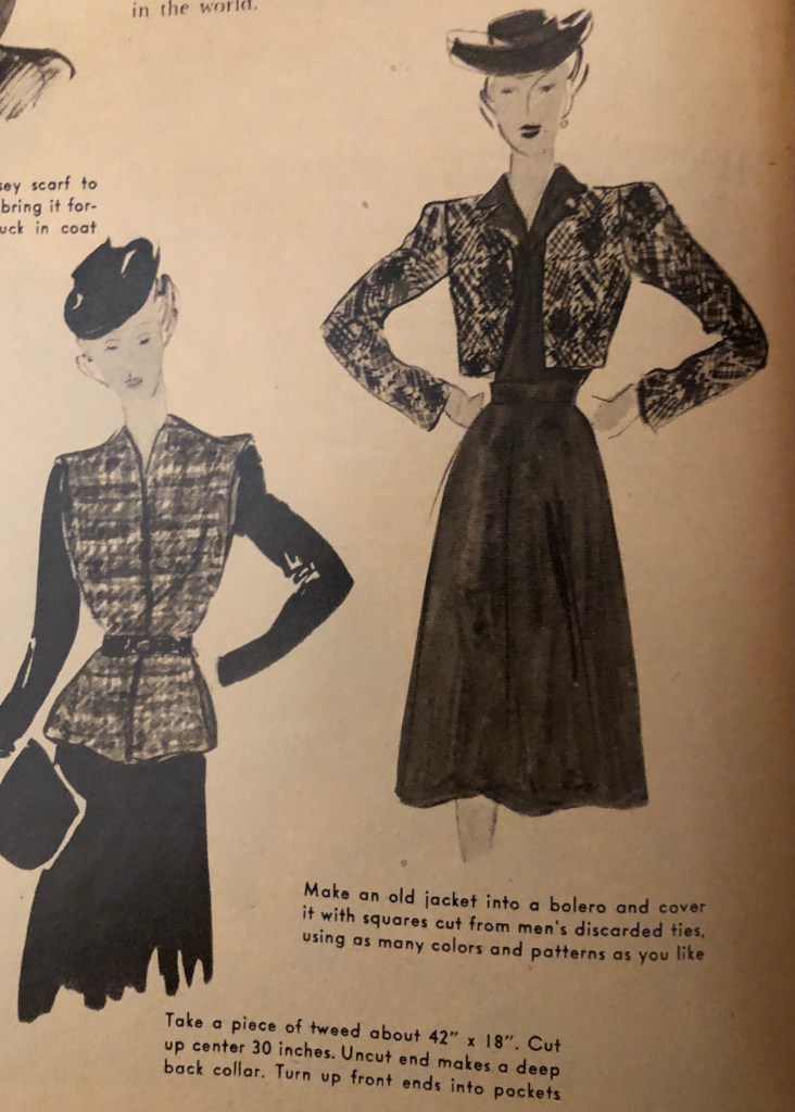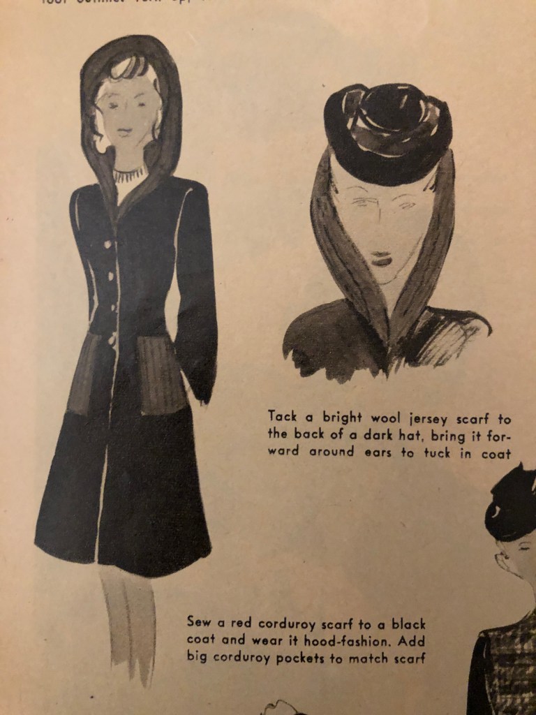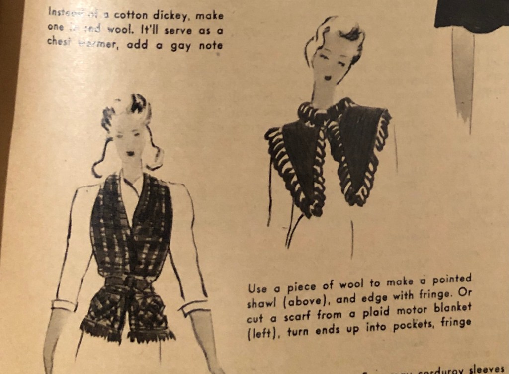 It’s that time of year again. Time to bring out the warmer clothes if you are in a place headed for fall and winter. During the war years, closed factories and shortages sometimes meant figuring out new ways to use old clothing to keep warm during cold months. Now, it was over 100°F this weekend here in Texas, but I know that there are many of you who are gearing up for cold weather. Maybe some of these hints from the October 1943 issue of Woman’s Day will spark some new ideas of your own. I’ve included the entire article, but there are some zoomed in photos afterwards so you can more easily read the captions.