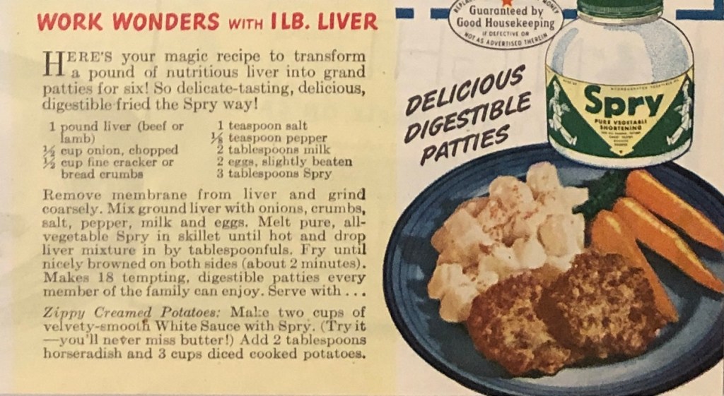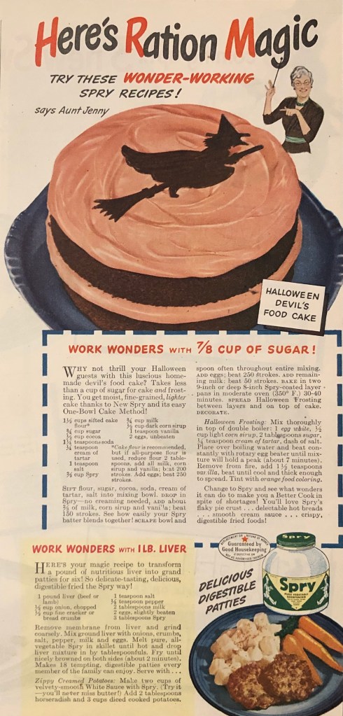 There are two bonus rationing recipes in the ad, too. One is for delicious digestible liver patties, which you might be interested in if you enjoy liver. This recipe is to make patties for 6 out of just a pound of liver. The Zippy Creamed Potatoes sound interesting, and I might try the recipe after I get to the store again. The ad says that you can use Spry Pure Vegetable Shortening in place of butter to get a nice white sauce for your potatoes. They claim “you’ll never miss butter!”