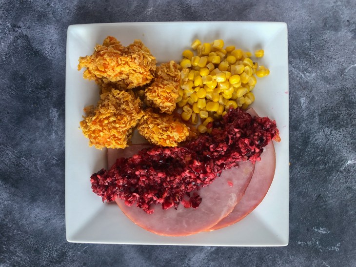 What a fun way to serve sweet potatoes! The cornflakes make a crunchy coating around the soft, smooth balls of sweet potatoes for a nice contrast of textures. While these were good, if we make them again, we’d adjust a few things. As the recipe is, the sweet potato balls aren’t sweet. If you are looking for a sweeter dish, adjust to taste before forming into the balls. We would add more honey, salt, and pepper. We’d also like to try Frosted Flakes instead of corn flakes to add a little more sweetness.