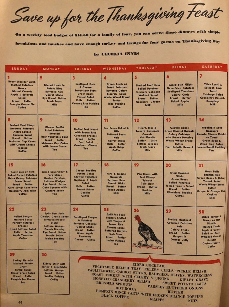 Today I’m using an article from the November 1942 issue of Woman’s Day. The article included an entire month of menus that would feed a family of four for $14.50 a week. That would allow the home front housewife room in her grocery budget to have a Thanksgiving feast. If you look at the calendar you’ll see that Thanksgiving 1942 was also November 26.