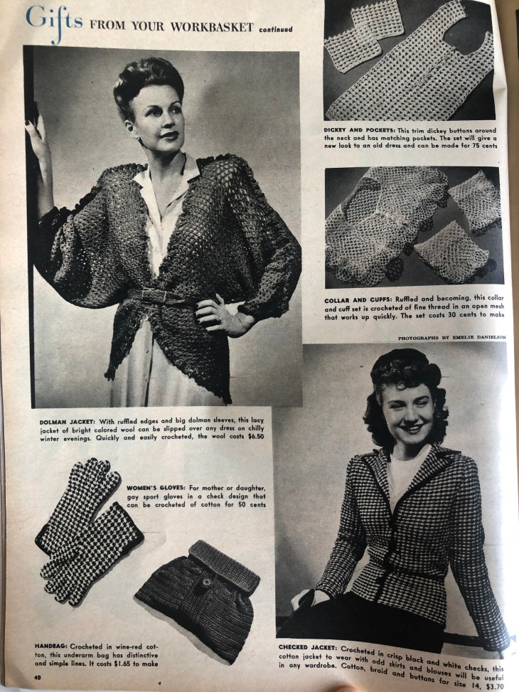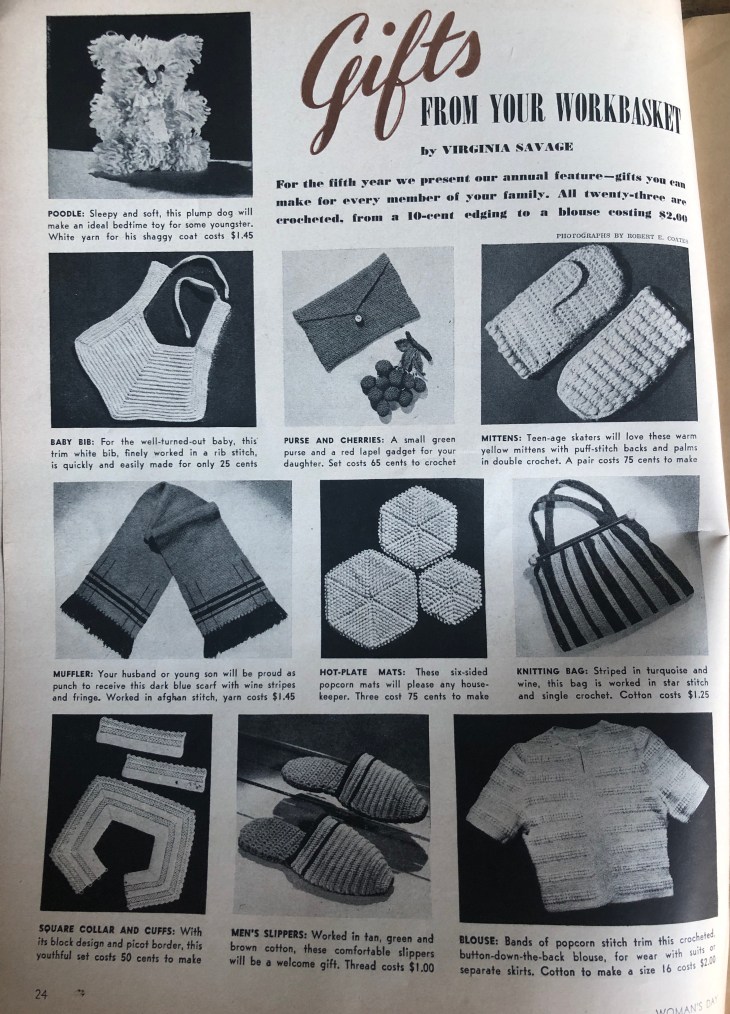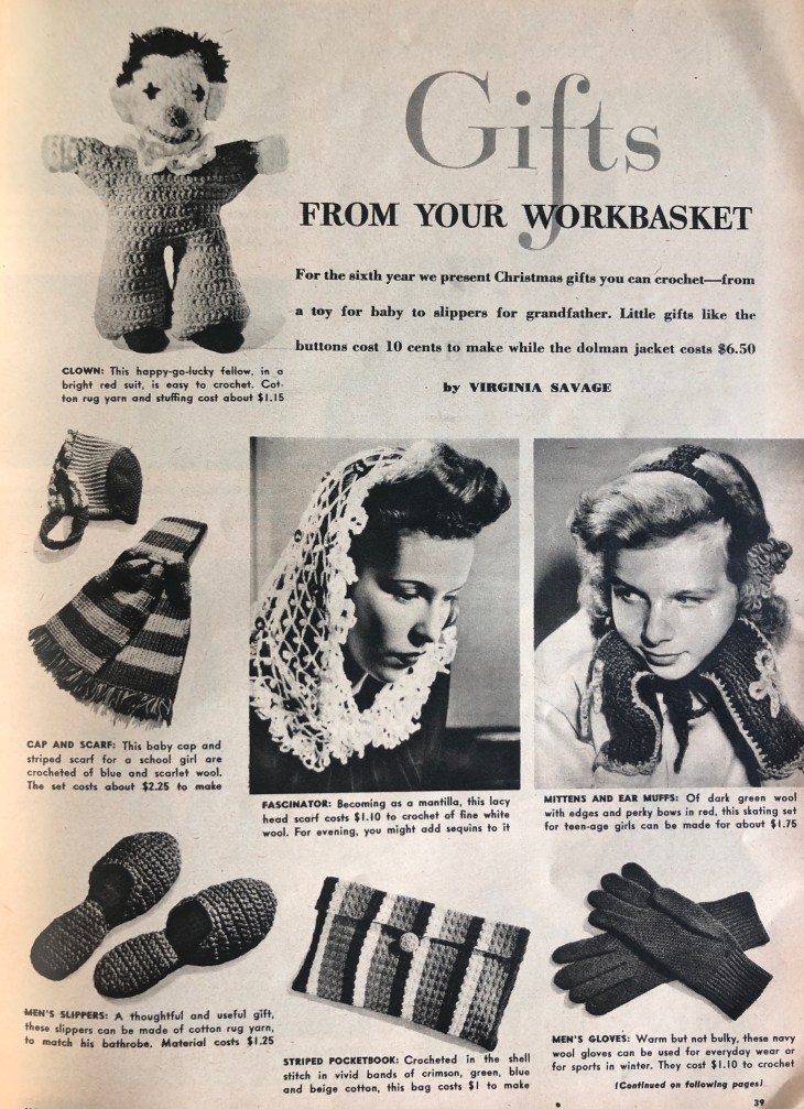 Before we leave November completely behind, I want to show you these articles from the November 1942 and 1943 issues of Woman’s Day. “Gifts from your Workbasket” was an annual feature that gave home front housewives gift ideas that they could make for friends and family. The war years were definitely a time to be frugal and making gifts was a great way to save money while still providing personalized presents for those on your list. By including these features in the November issues, it allowed women time to send away for the patterns for items to be completed by Christmas.