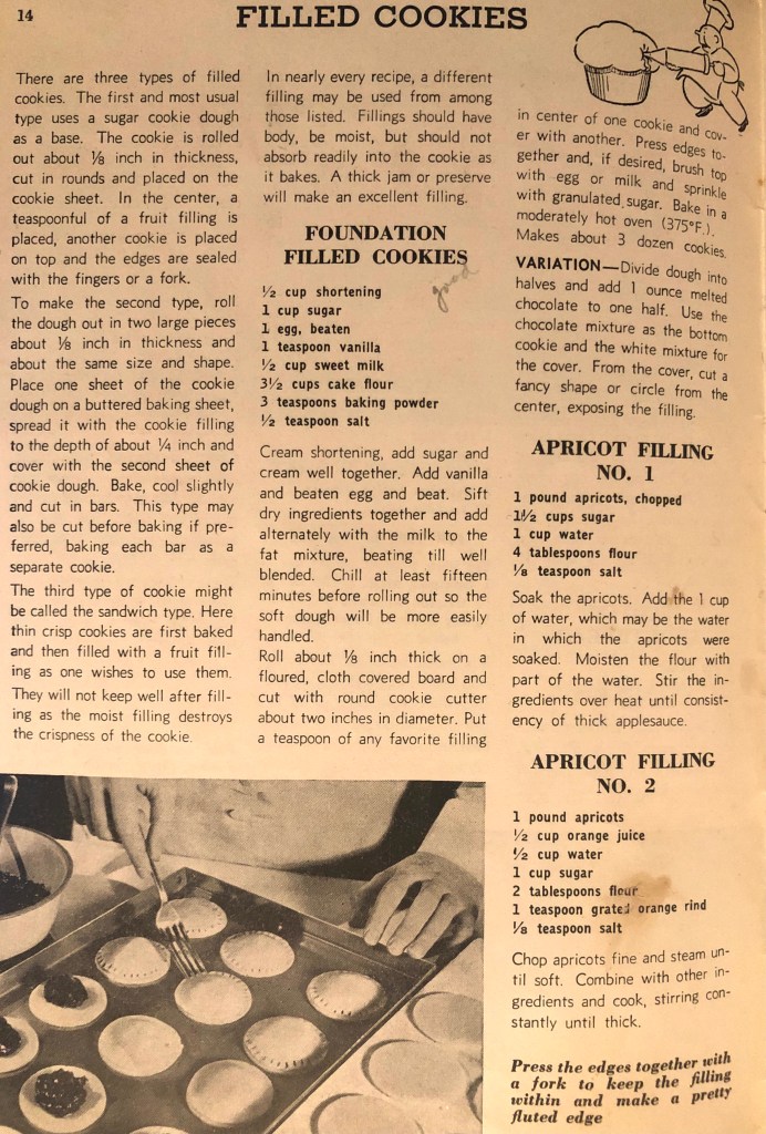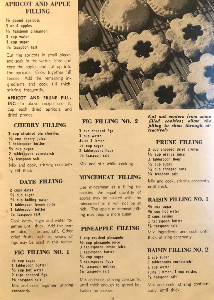 You know how sometimes the world works in mysterious ways? Two of the marked recipes were cookies that my family has made every year for many, many years, so those are two that I have chosen. This first cookie is actually two recipes–one for the cookie and one for the filling. There are several options for the filling, but I wanted to make the date filed ones because that’s what my family has always made. Instead of typing out the recipe for you today, I’m going to include the entire two page spread so you can choose your own filling adventure.