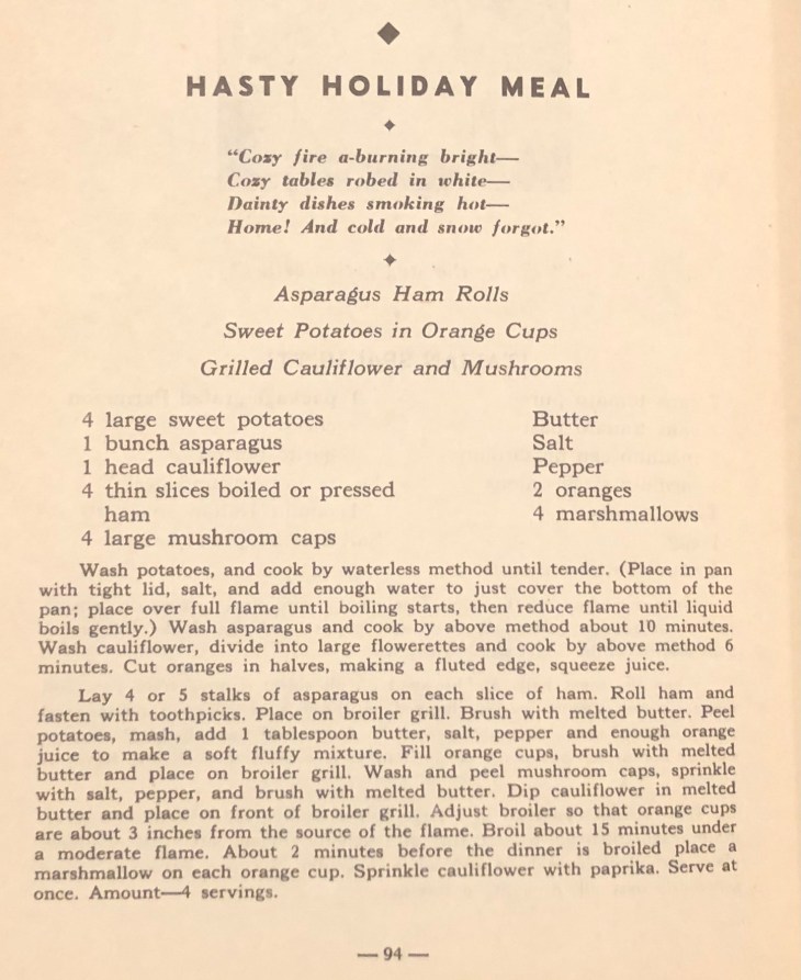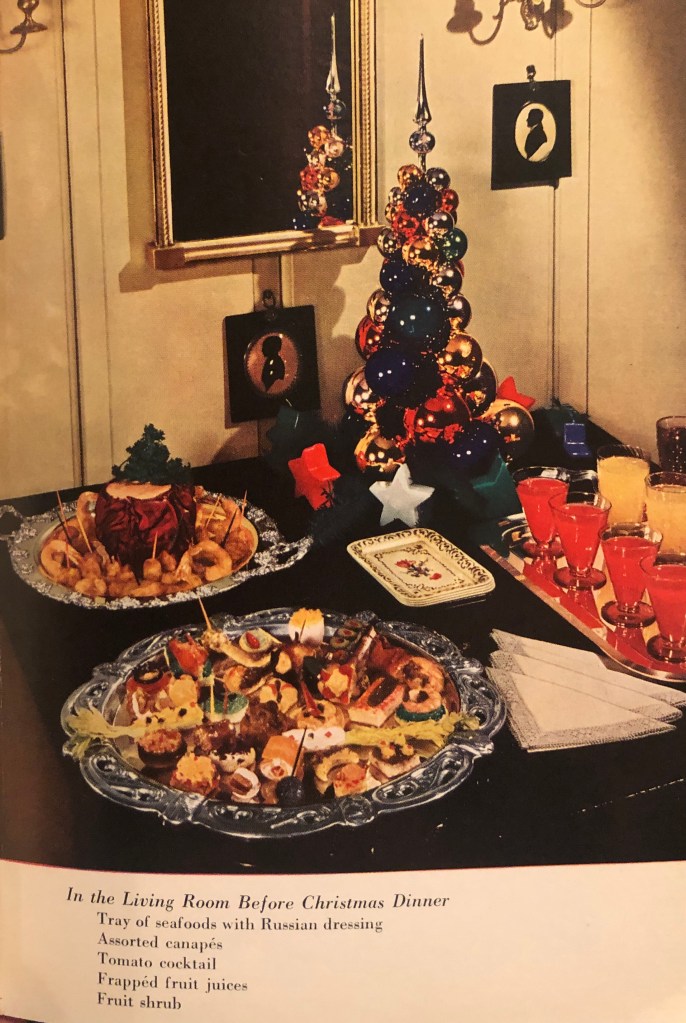 This month’s menu is from the Wyandotte County Gas Co.’s Your Gas Range Cook Book (1940). It’s for the days you are busy decorating, shopping, or wrapping gifts and don’t have much time to spend on meals. I’m also including a great photo from Ruth Wakefield’s Toll House Tried and True Recipes (1940). It’s a picture of a living room food spread on Christmas Day. There’s a menu of pictured items listed at the bottom. I love the color photos that show how the tables might have looked if we were to step back in time to Christmas morning 1940.