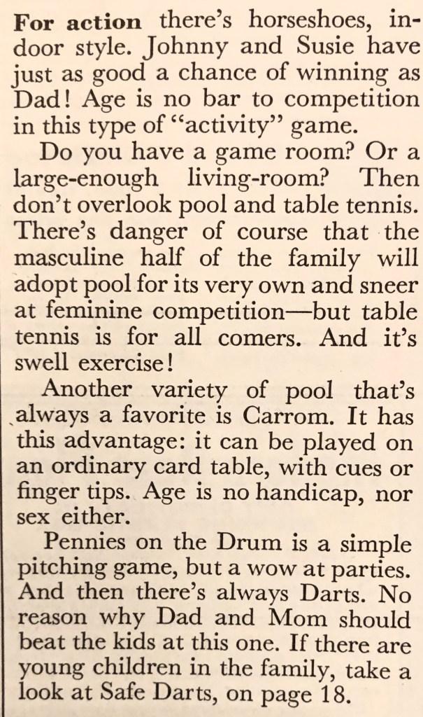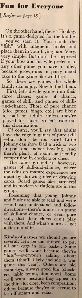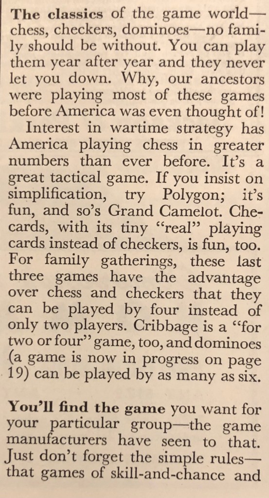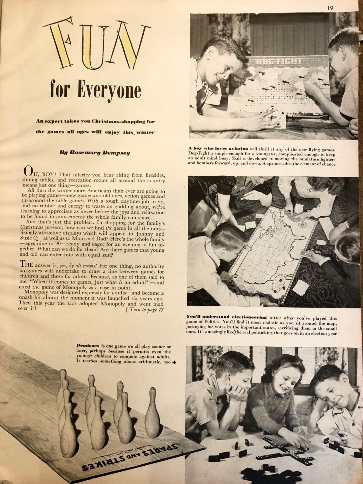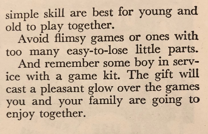 How might a home front family spend the days between Christmas and the New Year? I’d wager that many of them would be playing games they received for Christmas. Here’s an article from the December 1942 issue of Better Homes and Gardens that gives us an idea of what those games would be. Notice that many of them are similar to games we play today.