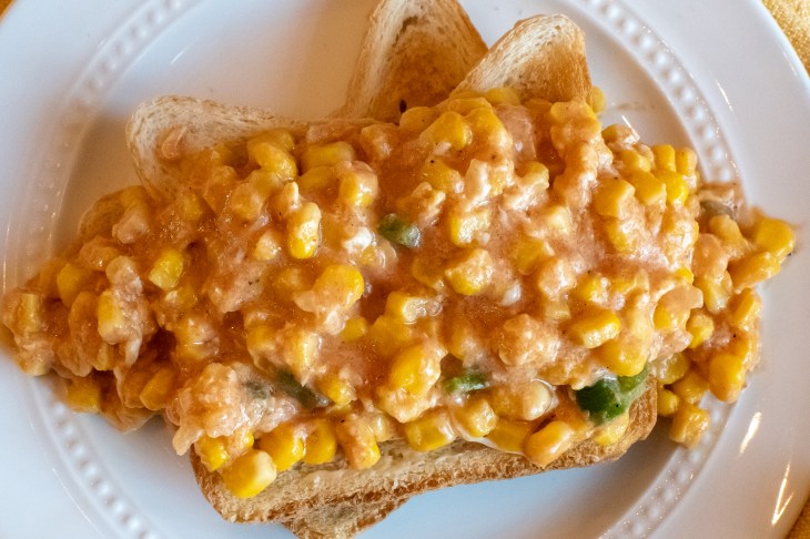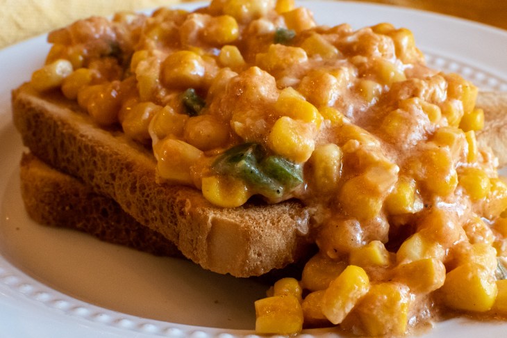 This was really good! Several of us tried it on bread, but we also liked it as a dip. We seasoned to taste with pepper. This would be an easy, warm lunch on a cold winter day. The corn was creamy with a hint of tomato flavor and some nice crunch from the green peppers. I think this could be a really versatile dish to have in your recipe arsenal. I ate it spread on top of bread like in the pictures. It would also have been a good sandwich filling or spread. It tastes great with corn tortilla chips, and I would have eaten it plain and not complained one bit. I could see this fitting into a quick meat, cheese, and crackers meal, as well.