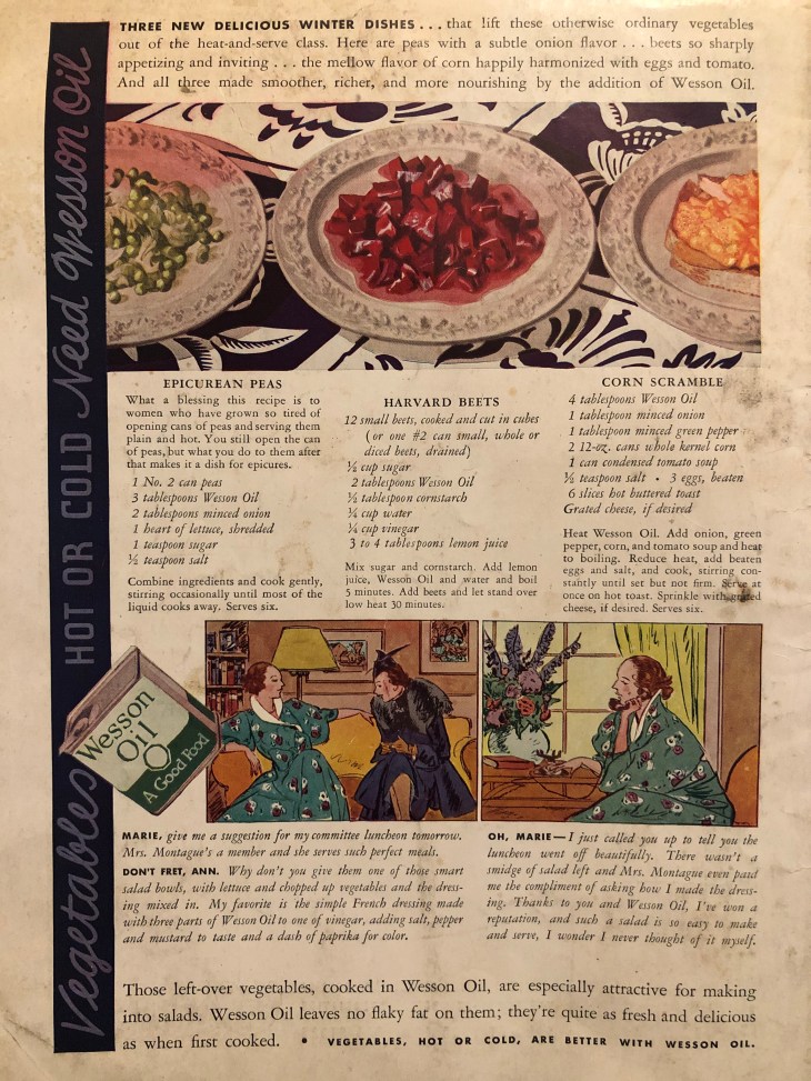 This recipe is from a January 1938 Wesson Oil ad. Like the Diamond Walnuts ad earlier this month, this one is a full-page, full-color advertisement with recipes and advice. I hesitated to use this recipe today since it’s from a little earlier than I usually write about, but no one threw away their 1930s recipes when the clock struck midnight on New Year’s Eve, 1939, so I’m pretty sure this dish graced the dinner table of many homes during the 1940s. In fact, it was on my table in 2021. I think we can dip into the 1930s every once in a while without feeling too guilty.