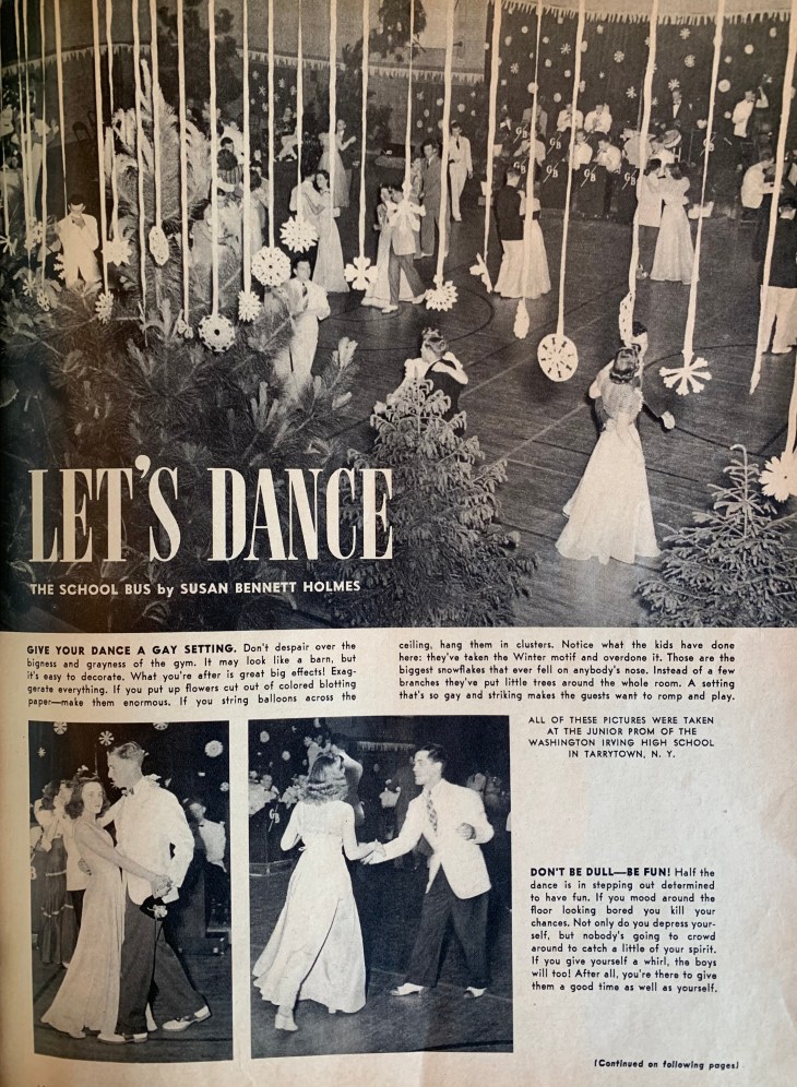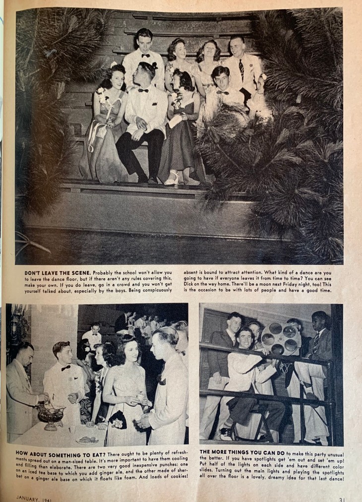 I wanted to end the month by showing you a fun article about high school dances. The suggestions in the January 1941Woman’s Day article are aimed at high schoolers. There are decorating tips, simple punch recipes, and etiquette advice. I love the images! Look at the clothing and hairstyles of both the young people and their chaperones. The pictures were from a real-life Junior Prom in New York.