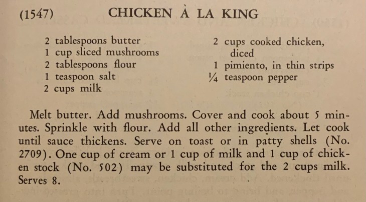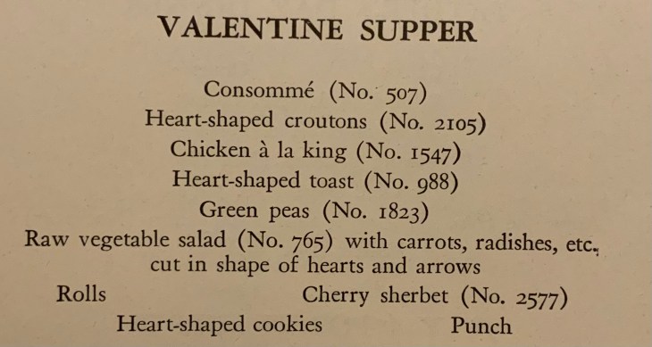 This month’s menu is from The New American Cook Book, 1941 edition. It’s a Valentine’s Day meal filled with heart-shaped croutons, toast, vegetables, and cookies. The main dish is chicken a la king. I’ve included that recipe below.