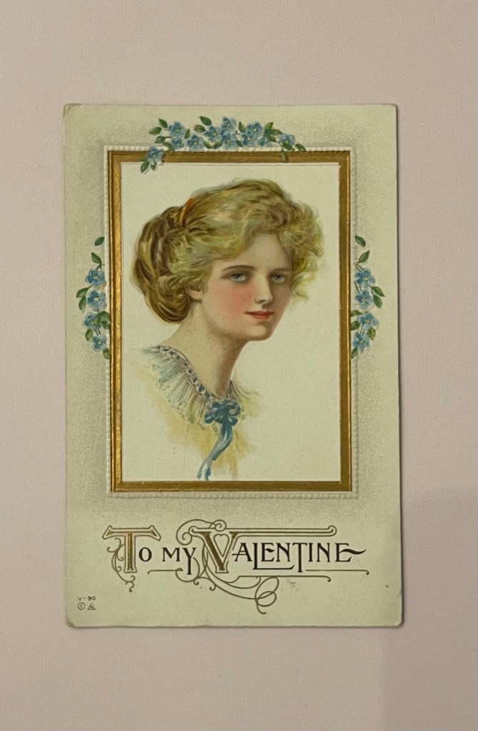 This postcard-style valentine was postmarked February 4, 1918. I like this style, too, and have found several with distinctive features like puffed hearts and cutout details. Most have some sort of note on the back.