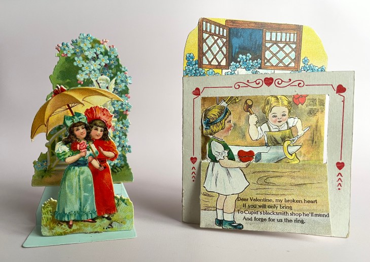 The valentine on the left says “Be My Valentine” on the bottom. When it lays flat, this part is easily read from the front. It folds up in front of the girls. The front piece on the right has folded down, making a window with the girl looking inside the blacksmith shop. The poem is interesting. Is this valentine asking for forgiveness? Or for their Valentine to come back?