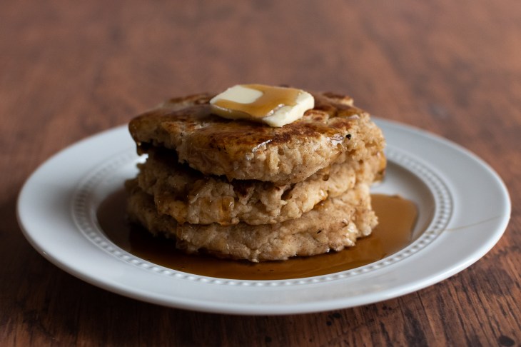 This recipe made fluffier, more cake-like pancakes than the other recipes we tried, but they were also much more crumbly than regular pancakes. Of the three kinds of pancakes we made, these were our favorites and the taste was closest to the pancakes we regularly eat. The crumbly texture was quite different than any other pancake I’ve ever seen or made, though, so be prepared for that if you want to try this recipe out.