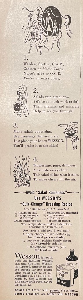 I wanted to try another recipe from a magazine ad this week. We’ve been eating more salads now that the weather is warmer, so when I saw this spring 1943 Wesson Oil ad, I knew it would be the perfect thing to try this month. I also love the patriotic poem that makes sure to tell the reader that salads are healthy, and keeping the family healthy was a home front housewife’s number one job.
