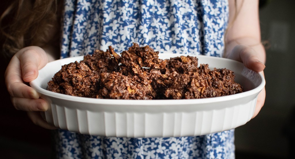 A couple things to note: The amount of chocolate might need to be adjusted to coat all of the ingredients. The recipe also didn’t make much. The amount in the dish below was all we made. This might be a recipe to double or even triple. They are so good that they won’t last long.