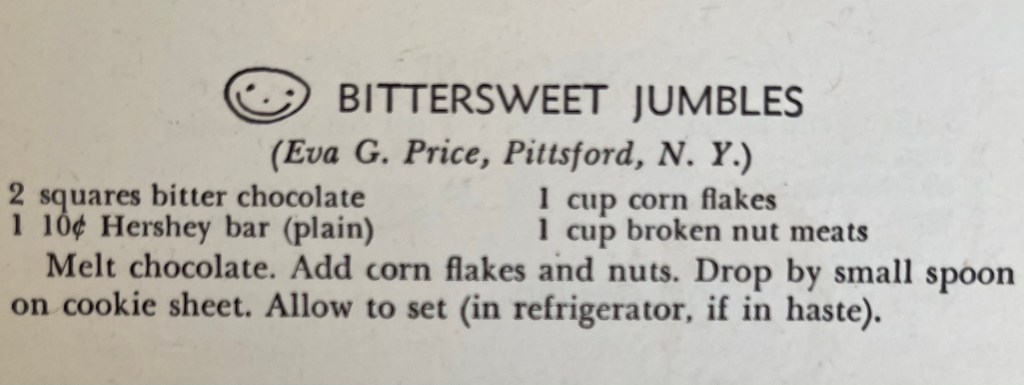 These quick and easy snacks are from the 1941 edition of Honor Among Cooks by Mary Spahr. The smiley face symbol designated recipes that children would especially love or could easily help make. My 3- and 7-year-olds were excited to help today.