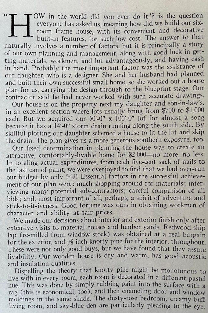 I finally found some homes under $40,000. In Lubbock, TX there were several options. Most were older homes that were in bad need of repairs. While they don’t really compare to our new home in the article above, one example was a similarly-sized home built in 1943. The owners are asking $40,000 currently. It didn’t have a fireplace, which the magazine home did, but it did have one more bedroom. I wonder how they would have compared when they were new.