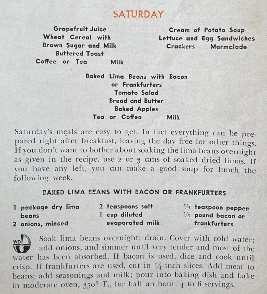 I was surprised at how much food was planned for the week. Breakfasts in my home are pretty simple affairs, but several of the breakfast menus had fruit, cereal, and bread in addition to more than one drink option. The dinner menus during the week also had two or three sides plus bread. This Saturday menu is a bit simpler for all three meals to try to keep the day free for things other than cooking.