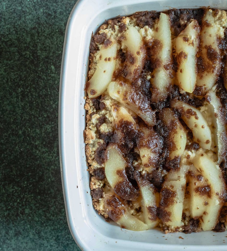This cake has a very dry and crumbly batter, but I wouldn’t say the finished cake is dry. The pears help with that. The pears are obviously the stars here, but the cinnamon and brown sugar topping adds just the right amount of sweet spice. The recipe is fairly easy and quick to make. The ingredients are simple and easy to find. It makes a nice cake to whip up for a last minute get together.