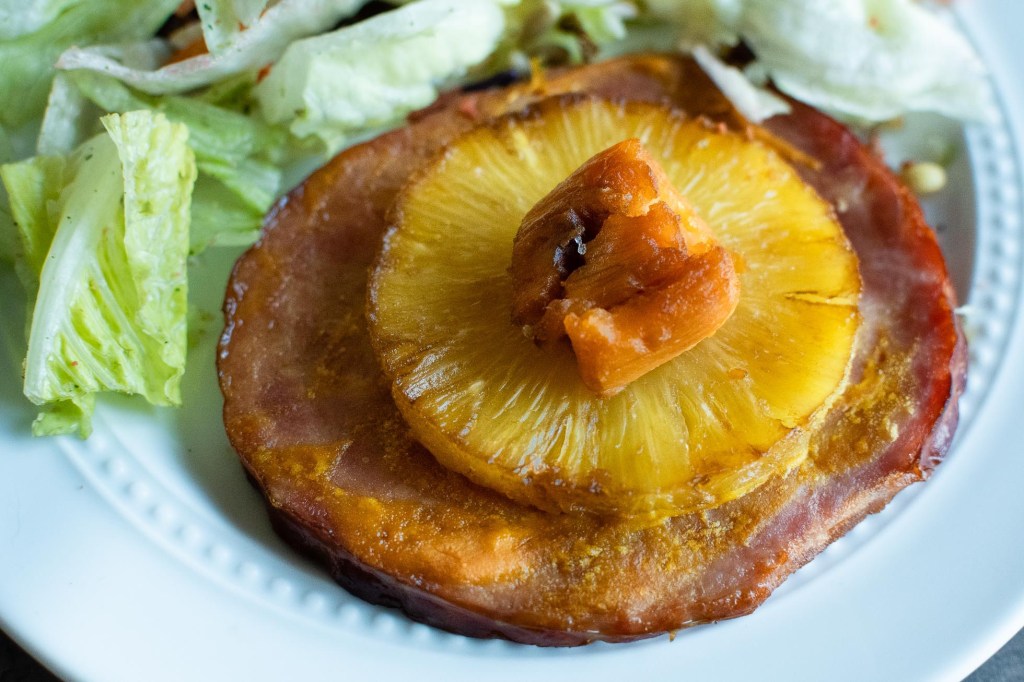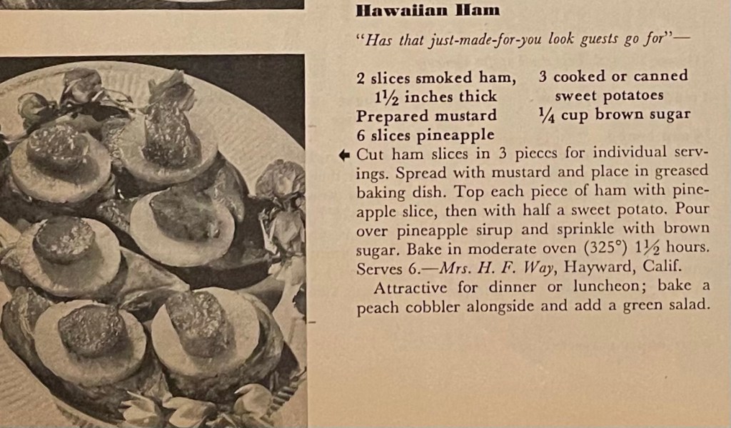 It’s been a while since I made something from a First Monday Menu. This Hawaiian Ham recipe is from the April 1941 issue of Better Homes and Gardens. There was a section called “Cook’s Round Table of Endorsed Recipes” that had recipes submitted by readers and tested in the Better Homes and Gardens Tasting Test Kitchen. This month’s consisted of ham recipes and cakes. The recipes were meant to be pulled from the magazine and even had holes already punched to allow for storage in a binder.
