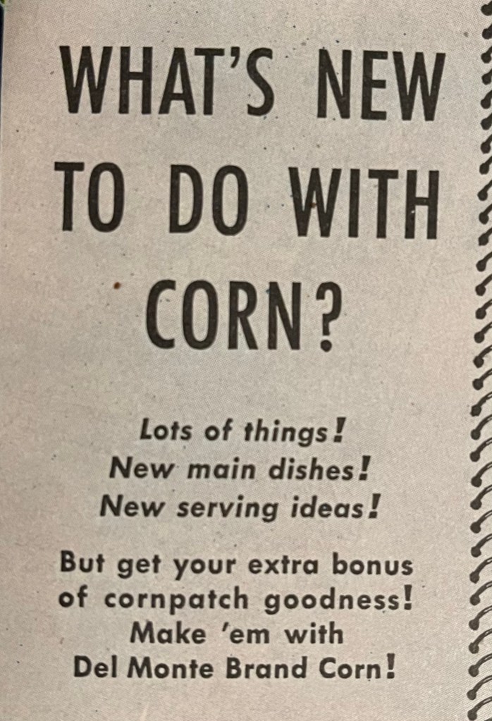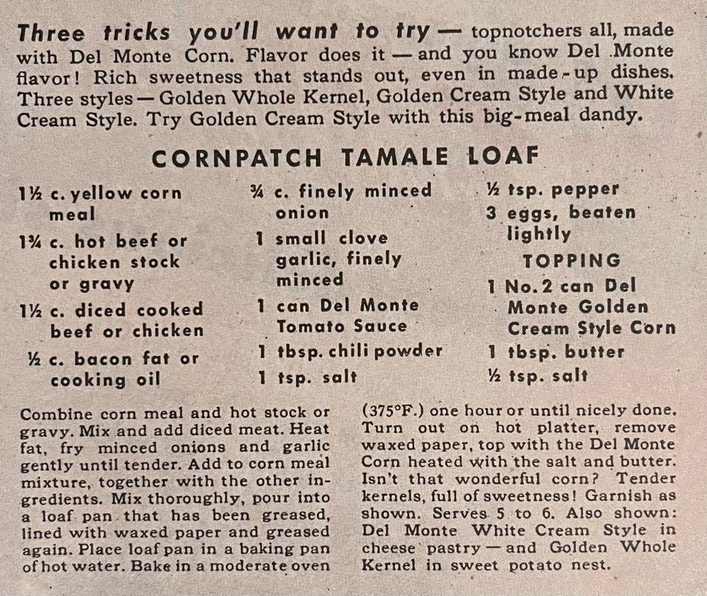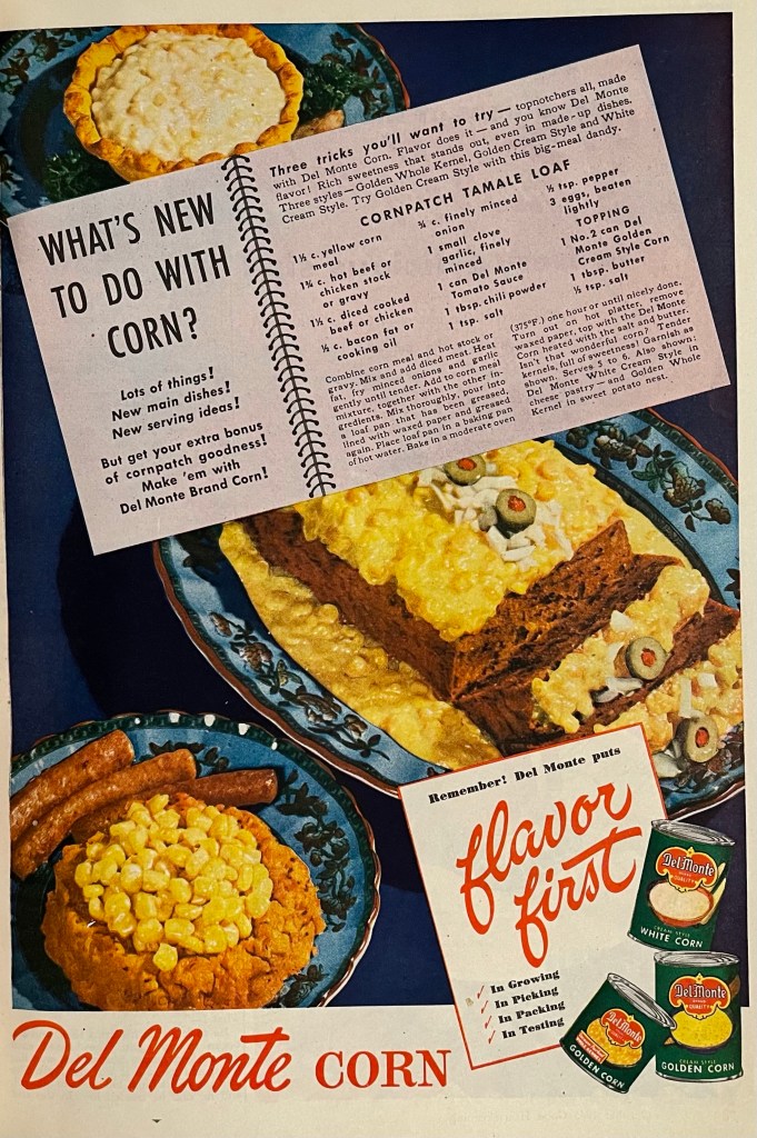 This is a Del Monte corn ad from the October 1945 issue of Better Homes and Gardens.