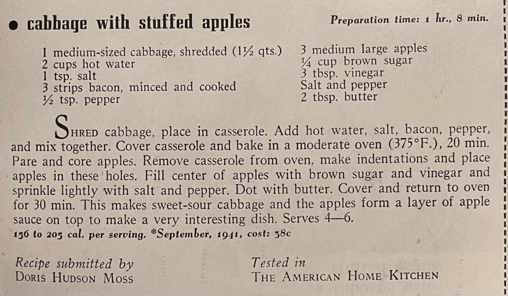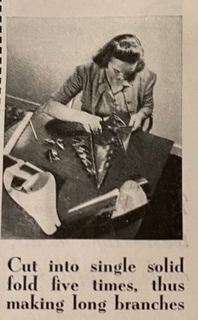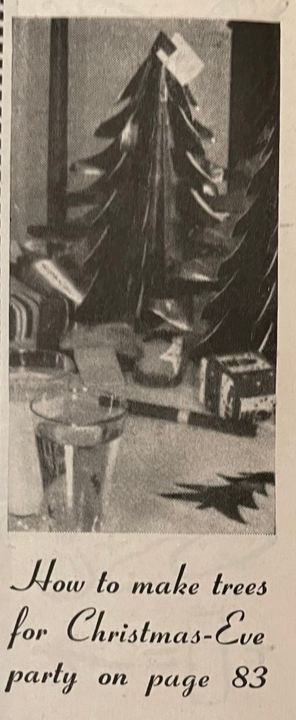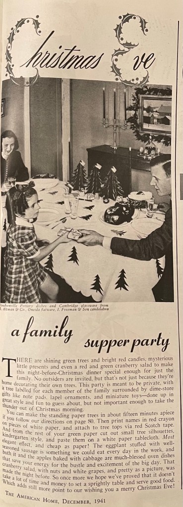This month, I am going to share more than one menu with recipes. Today’s menu comes from the December 1941 edition of The American Home. The menu is for a Christmas Eve family supper party complete with individual tree decorations and small, inexpensive gifts. If you scroll down, you’ll find the recipes and instructions for making the table-top trees.