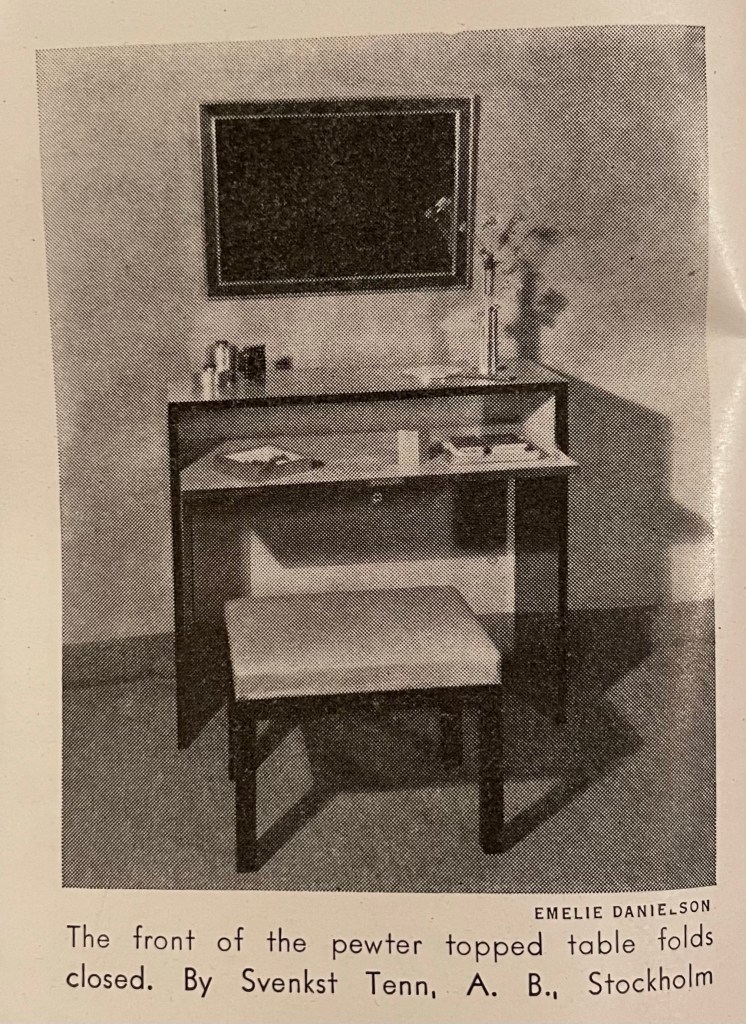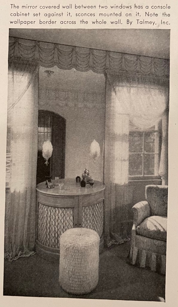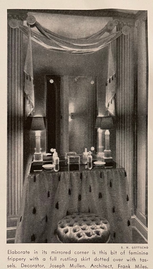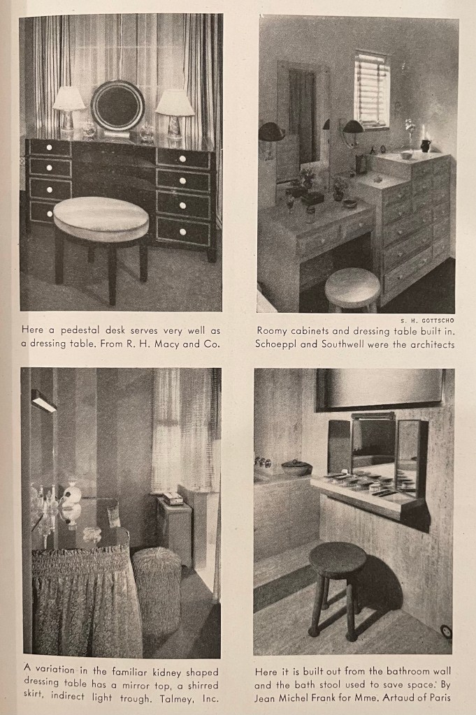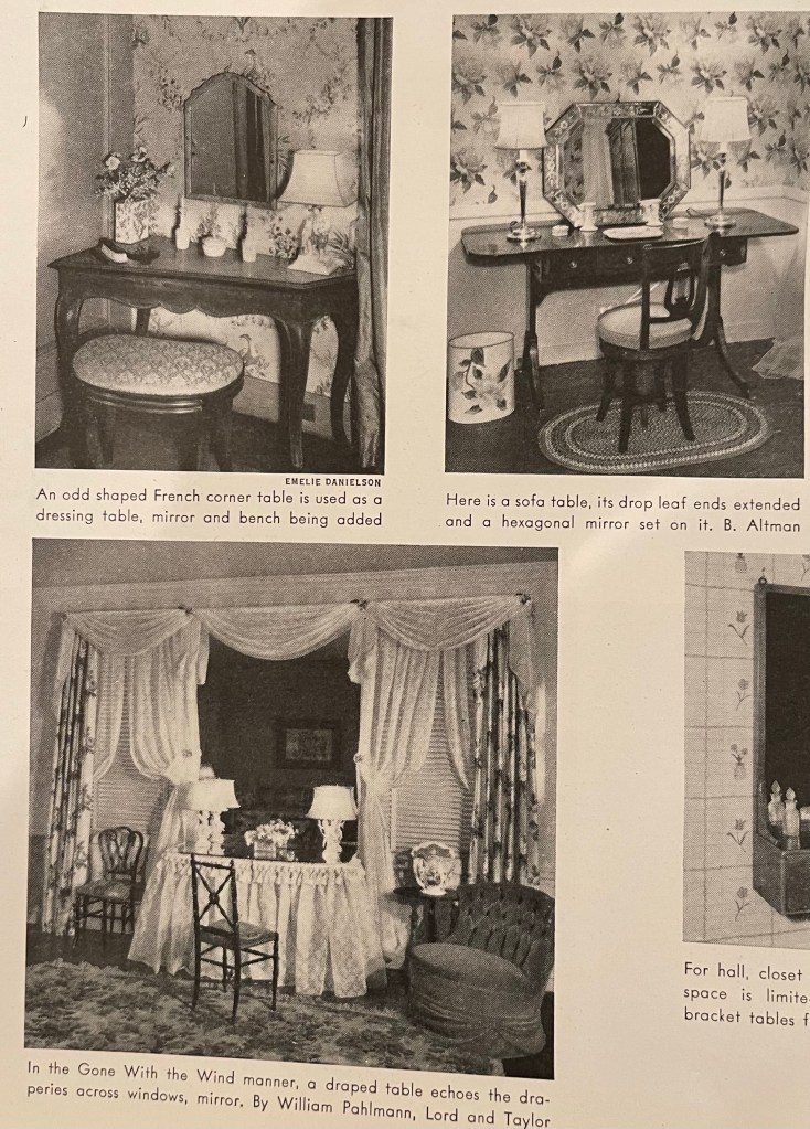 I love this article about dressing tables. I’ve been enjoying thumbing through home decorating magazines from the first half of the 1940s. It’s almost like time travel. You get a peek into what daily life was like for the magazine’s readers. I can picture a woman sitting at her kitchen table, leafing through the pages, and thinking— How shall I decorate my dressing table?