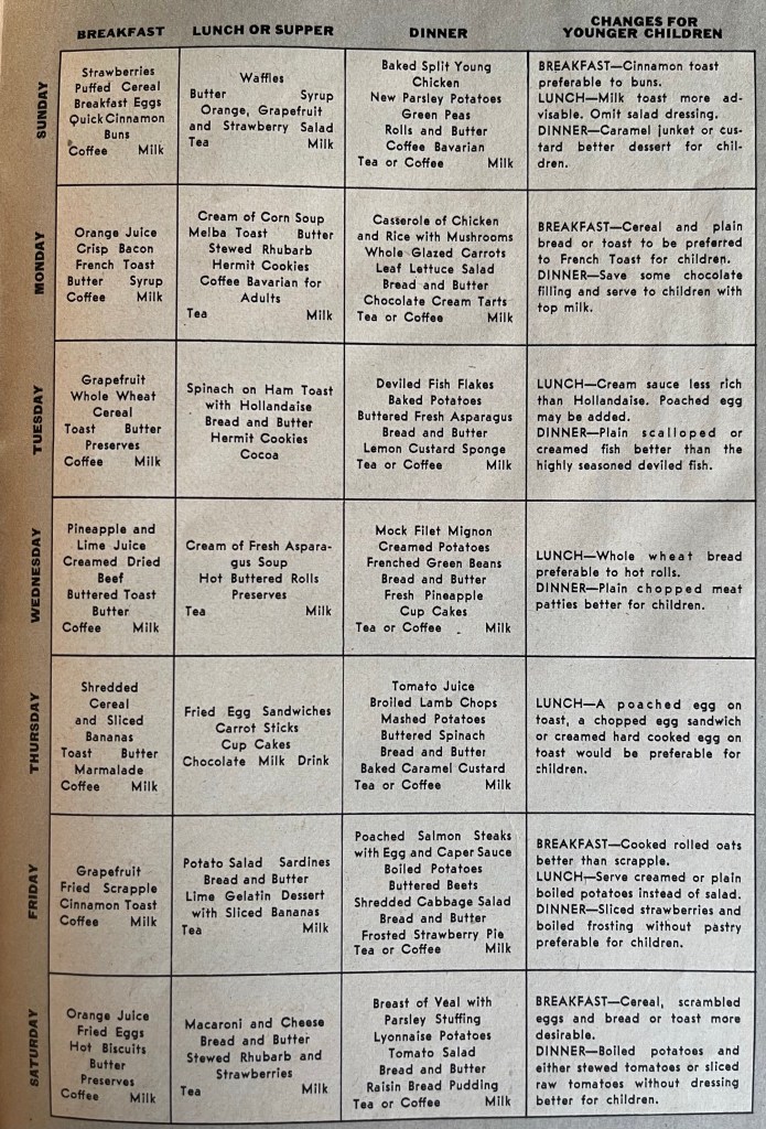1. The changes are similar to ones I have seen in books on raising children in the tropics. I don’t know what the American school of child nutrition was at the time but in the tropics the idea was bland = nutritious and easy to digest. So plain potatoes instead of potato salad which would be made with mayonnaise, plain fruit as pastry was thought to be too rich but an emphasis on milk.