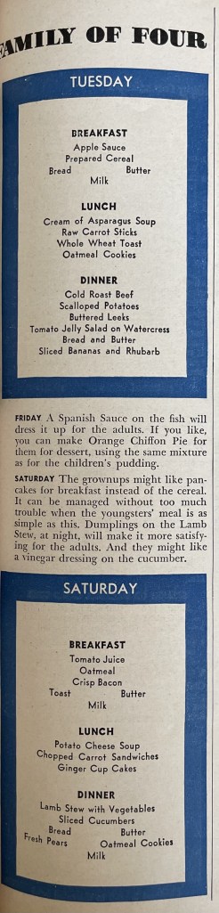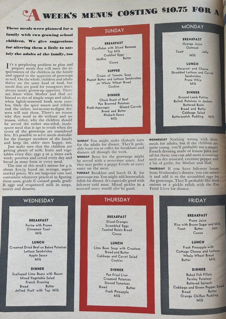 Here is an entire week of menus for you to look at from the May 1941 issue of Woman’s Day. They are for a family of four with two school-aged children. Can you imagine feeding a family of four for only $10.75 a week? The cost was based on the average supermarket prices at the time of writing. I really like that there are suggestions for each day to help adjust the menus for your needs or to make things easier to plan.