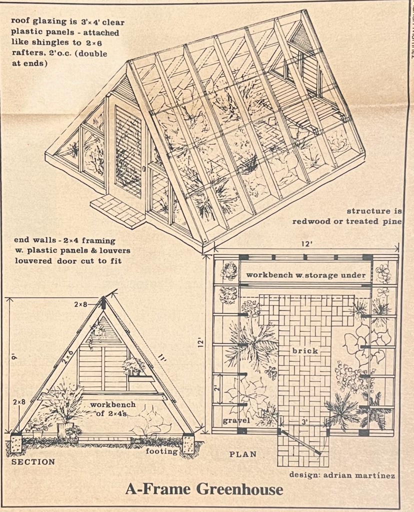I also was thrilled to remember that tucked inside the guide in a section about growing mums, there is a stack of newspaper pages from the California Living Magazine section of the San Francisco Sunday Examiner and Chronicle. The pages include the entire Jack Kramer article “Grow Your Own Greenhouse”. The date is October 6, 1974. Someone used this gardening guide from 1943 until at least 1974. Someone held on to their copy and referred back to it for at least thirty-one years. That amazes me! I wonder if they ever made that greenhouse?