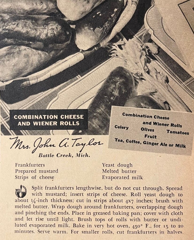 The menu came from the May 1940 issue of Woman’s Day. The article was a round up of prize-winning reader-submitted recipes that included cheese as an ingredient. The main winner won $25 and several other readers won $2 for their recipe submissions. The menu for today includes a main dish from the $25 winner, Mrs. John C. Taylor of Battle Creek, Michigan. (A quick Ancestry.com search shows that Mrs. Taylor and her husband were living in Battle Creek during both the 1940 and 1950 censuses. Sometimes it is nice to know if the people I read and write about made it through the war.)
