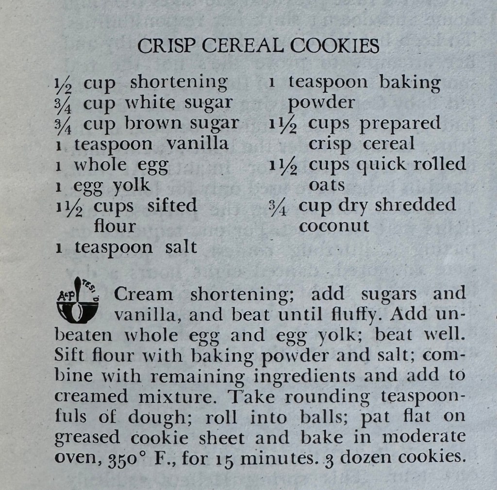 This cookie recipe is from the July 1939 issue of Woman’s Day, so it’s a little earlier than our usual wartime recipes. It’s from an article by nutritionist Marion Rouse Budd called “Make your Refrigerator Do Your Work For You”. She advised women to cook early in the day and serve cold dishes to avoid getting too warm while standing over a hot stove in the summer. Budd also said that at least one hot dish or beverage should still be served at each meal. These cookies never touch a refrigerator, so I’ll add the rest of that menu near the bottom of this post so you can see it.