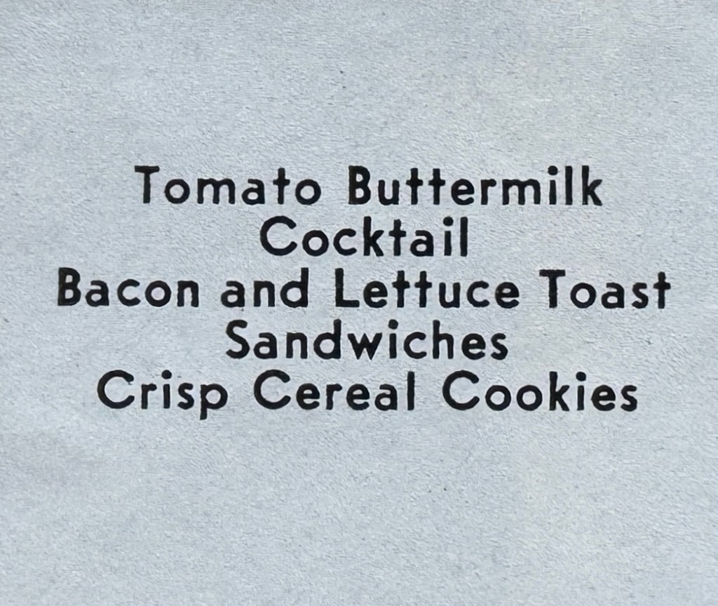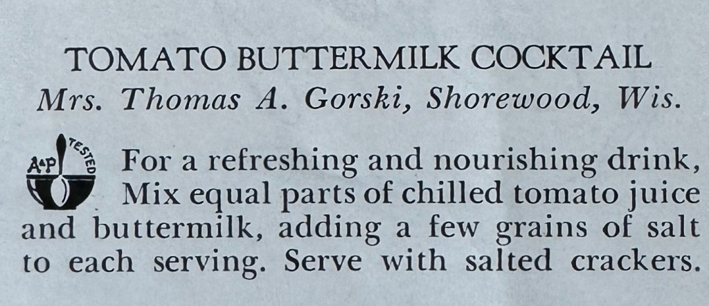 Finally, here is the recipe for the Tomato Buttermilk Cocktail. I wanted to include it because it is this menu’s recipe that gets help from the refrigerator in the form of chilled tomato juice and buttermilk. I also like that it was sent in by a reader.