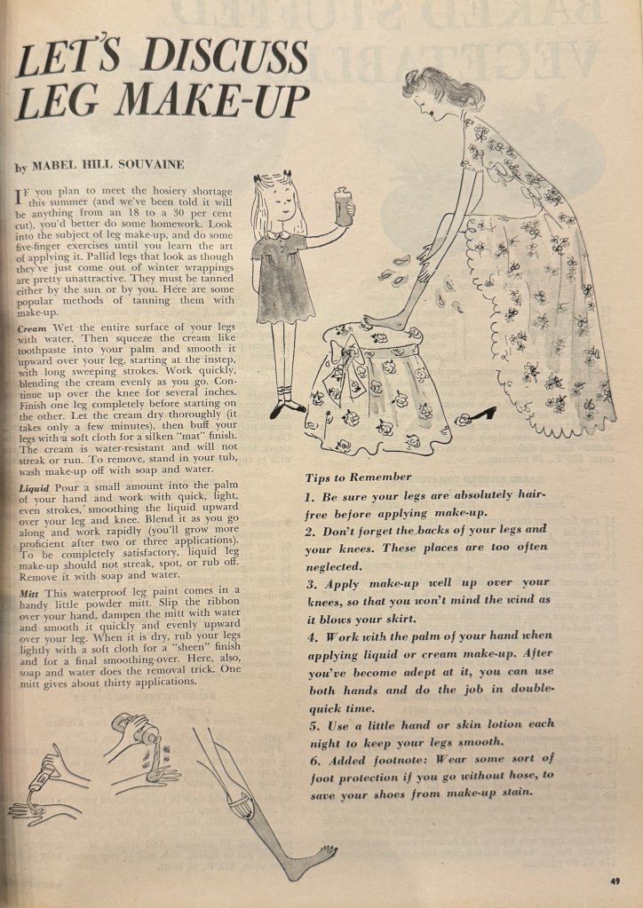 I think that sometimes when we think of wartime shortages we forget that it affected women’s lives in ways other than imposing challenges to their meal planning. This article from the July 1945 issue of Woman’s Day is a reminder of that.