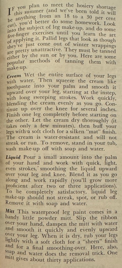 It’s also a reminder that we’ve come a long way in understanding sun safety and in the creation of self-tanners. This article states that your legs “must be tanned either by the sun or by you”. There was also an article in this issue about how to safely sun-bathe with babies.
