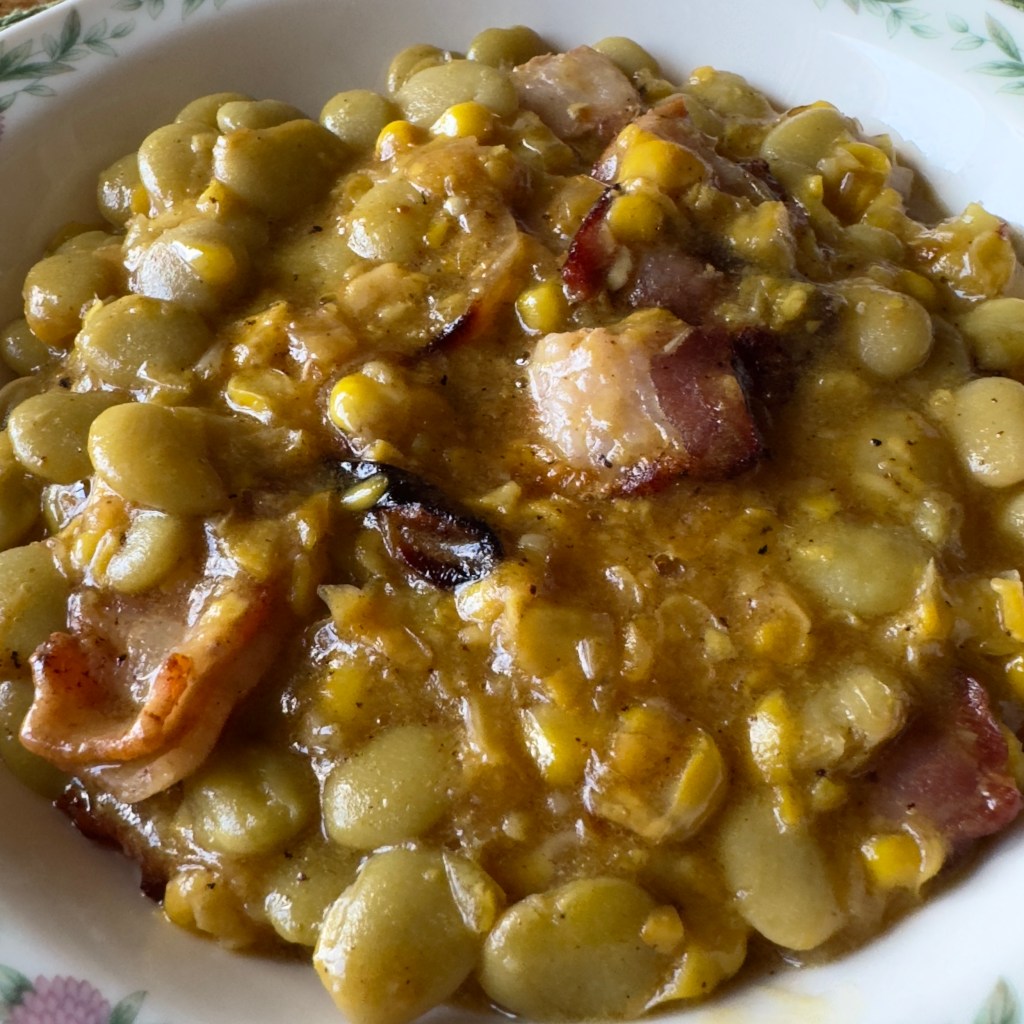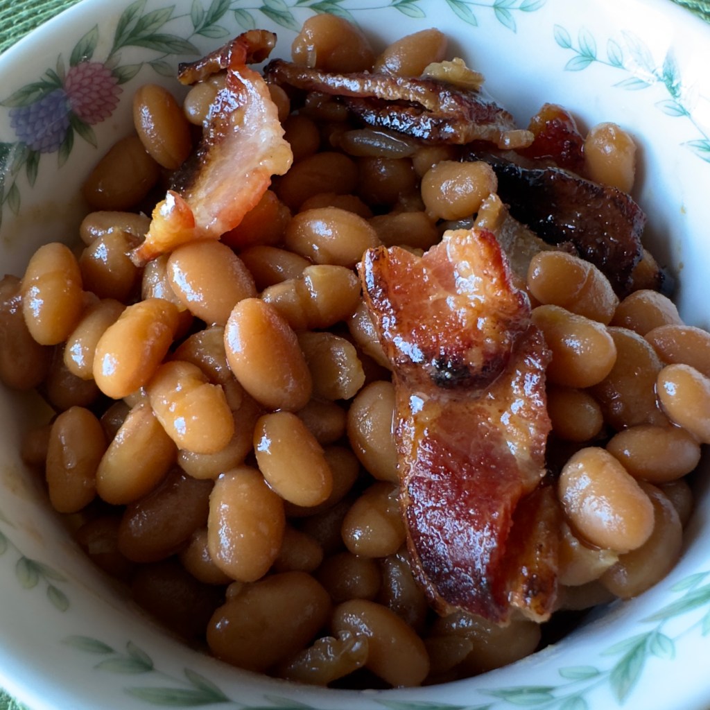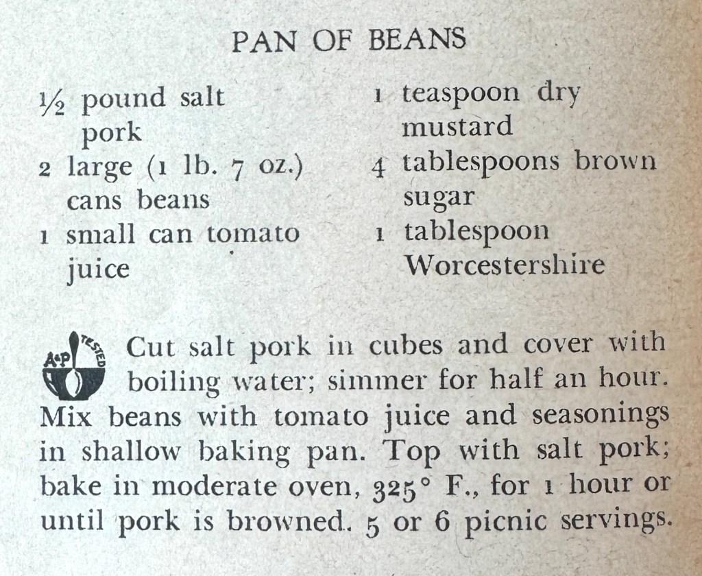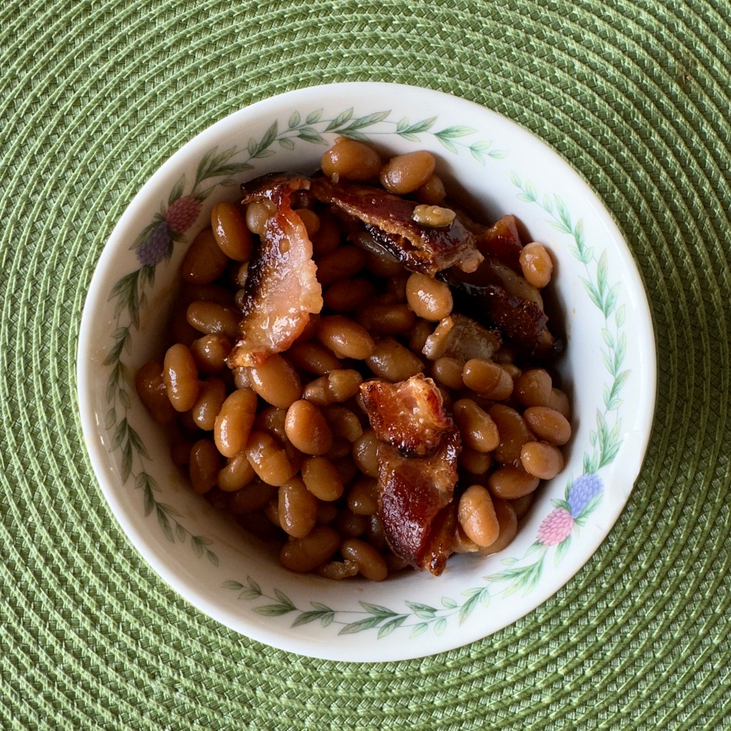 We used bacon instead of salt pork. These were really flavorful baked beans that would make a great side dish for any meal. This is the type of dish that you would have to cook onsite or take in an insulated bottle. We eat beans like this often in the summer, especially with hot dogs or hamburgers. I’m not sure I’d want these beans on a picnic where I’m sitting on the ground, though. If I had a picnic table, great! But I wonder if they’d be a bit messy at a picnic where you are sitting on a blanket. I definitely recommend the bacon–it’s the best part!