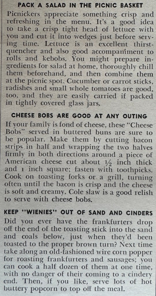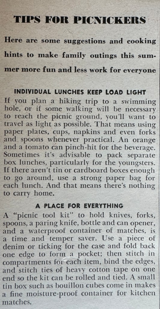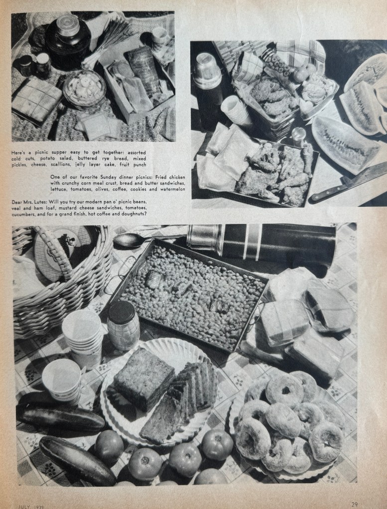 The July 1939 issue of Woman’s Day had a two page spread about picnics. I’m going to show you the entire article because the photos are fantastic and a really good way to learn what an ideal picnic spread would look like. Keep in mind these were styled by the magazine, but they still represent what the reader would have expected a picnic to possibly look like. I love looking at the dishes and food containers as well as the way the food is presented.