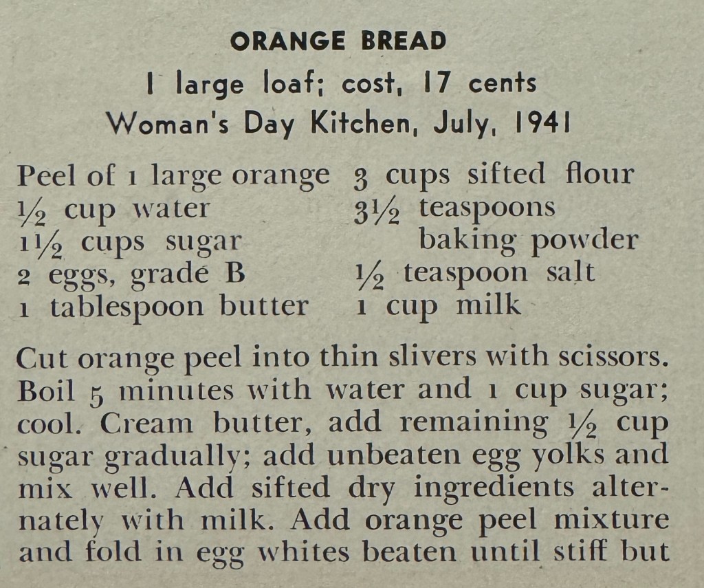 My taste-testers had mixed opinions on this bread. If you like orange marmalade, I think you’ll like this loaf. The orange peel has a strong flavor that tends to a bit polarizing. Those of us who enjoyed it found that we liked it best served warm with some butter. I really think this could be served in place of a dinner roll with certain meat dishes. The recipe called for a day of storage before serving, so we made it one day and ate it the next.